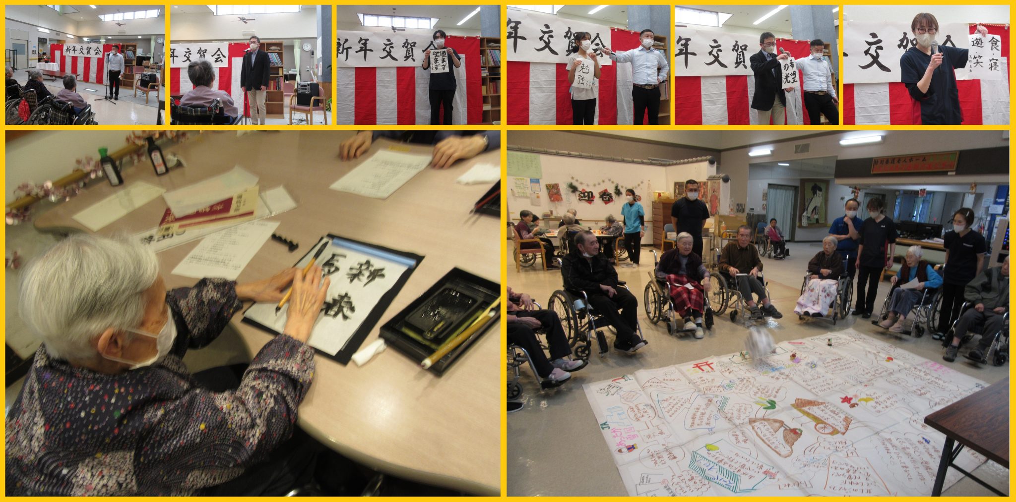 利用者の皆さんは紅白歌合戦を観たり、遅くまで飲み食いされた方もいたようで、皆さん穏やかに年越しをされたようです。今日は新年を迎え交賀会を行いました。今年105歳を迎える方を筆頭に7名の方が100歳以上の長寿。米寿を迎える方が2名、喜寿を迎える方が1名おります。