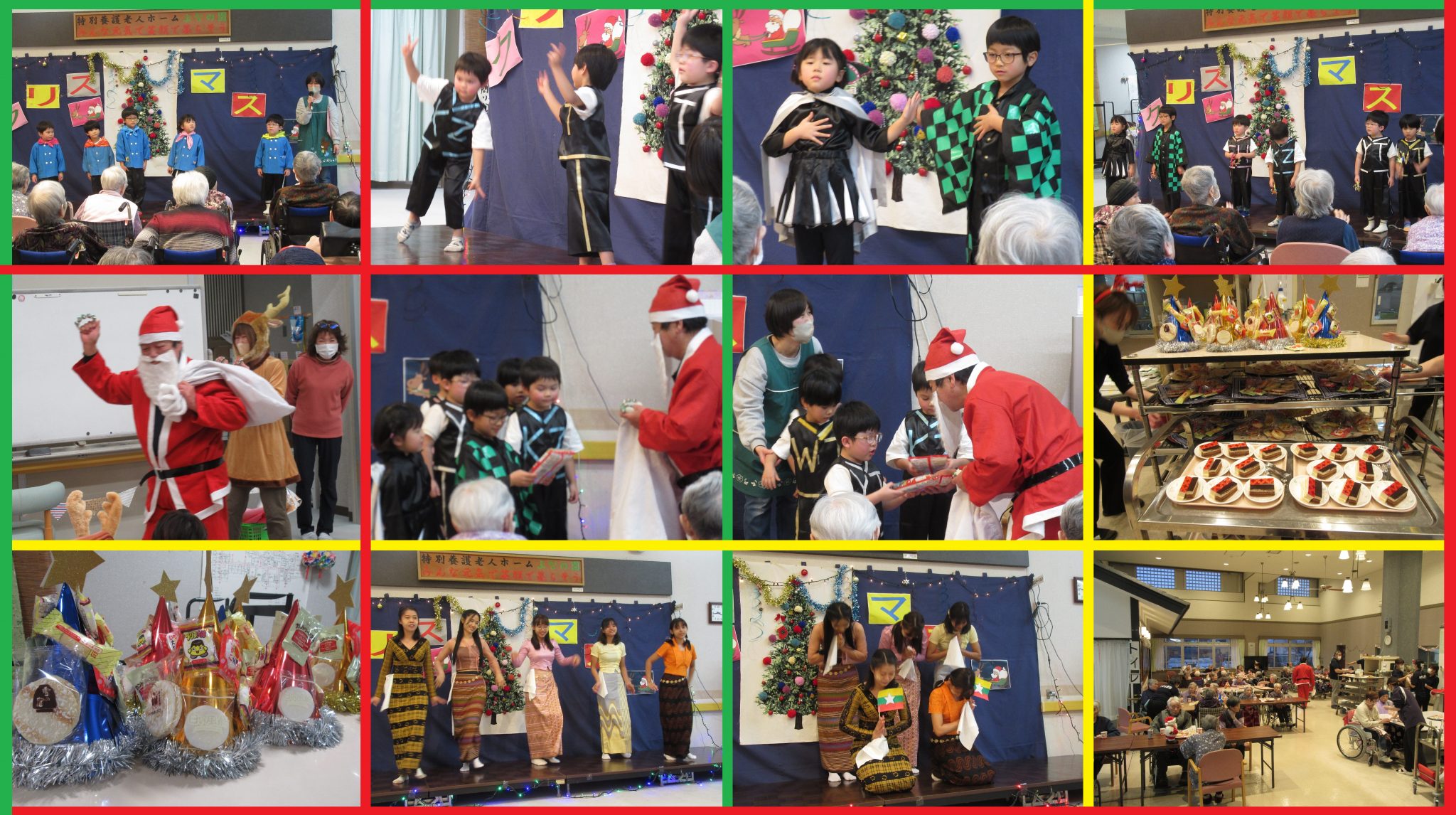 12月25日 今日はクリスマス✨ぶなの園では毎年クリスマスに忘年会を行っています。今年のゲストは、川舟保育所のみなさんでした。元気な踊りに手をたたいて大歓迎。「あや~めんこい」「あや~めんこい」と園児のみなさんから若さを吸い取らせていただきました (^^